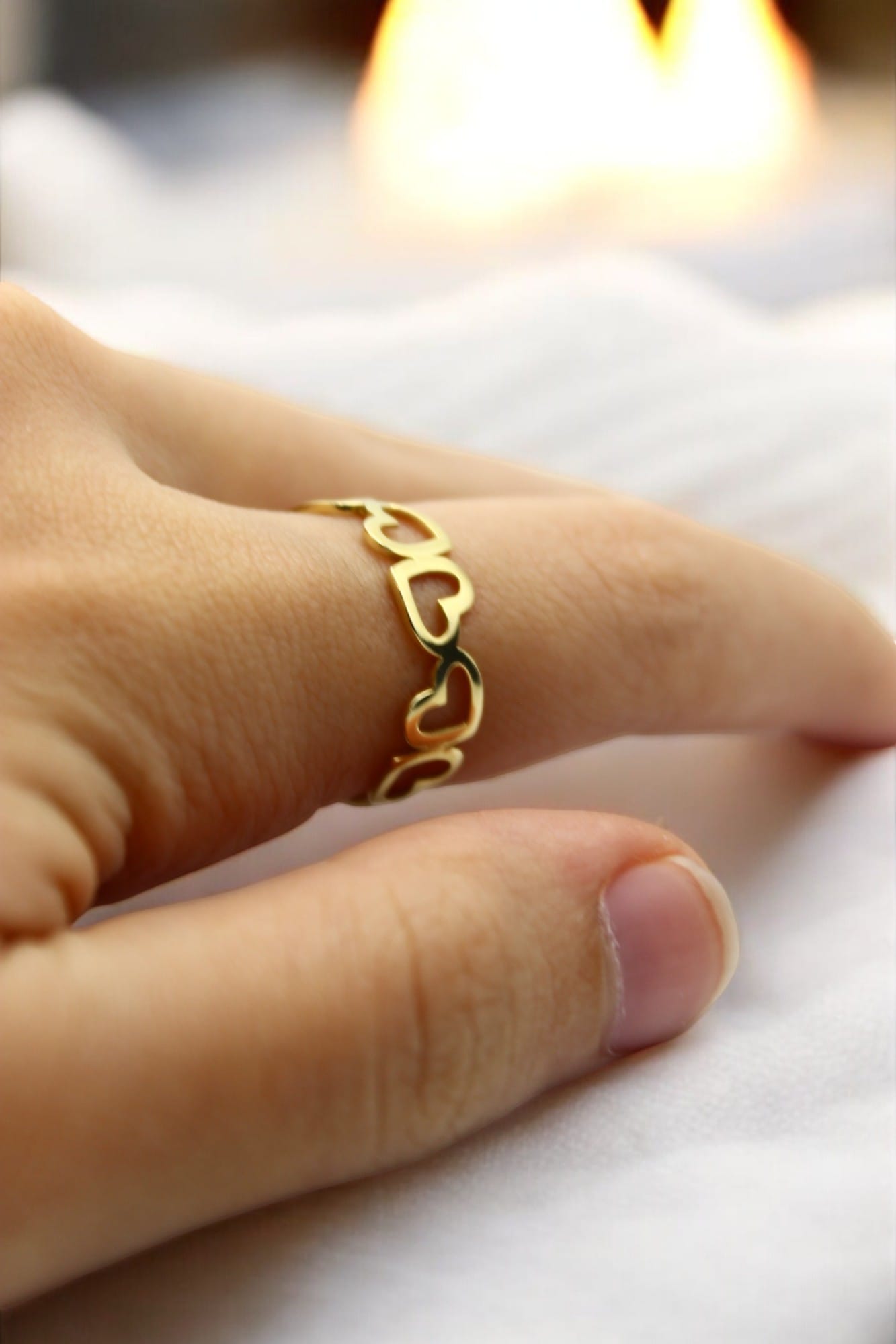 altın rengi metalden yapılmış, üst kısmında iç içe geçmiş kalp şekilleri olan bir yüzük görülüyor. Yüzük, ince ve zarif bir yapıya sahip olup, sadeliği ve romantik temasıyla dikkat çekiyor. Kalp detayları sayesinde hem şık hem de anlamlı bir aksesuar olarak kullanılabilir.